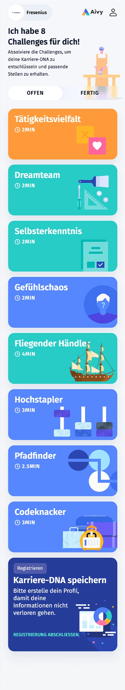 1Aivy ist ein von Fresenius unabhängiges Unternehmen. Dies bedeutet, dass Fresenius keinen Zugriff auf deine persönlichen Daten erhält, sie nicht verarbeitet oder speichert. Die Ergebnisse von Aivy sind ausschließlich für dich bestimmt und haben keinen Einfluss auf das Bewerbungsverfahren bei Fresenius.